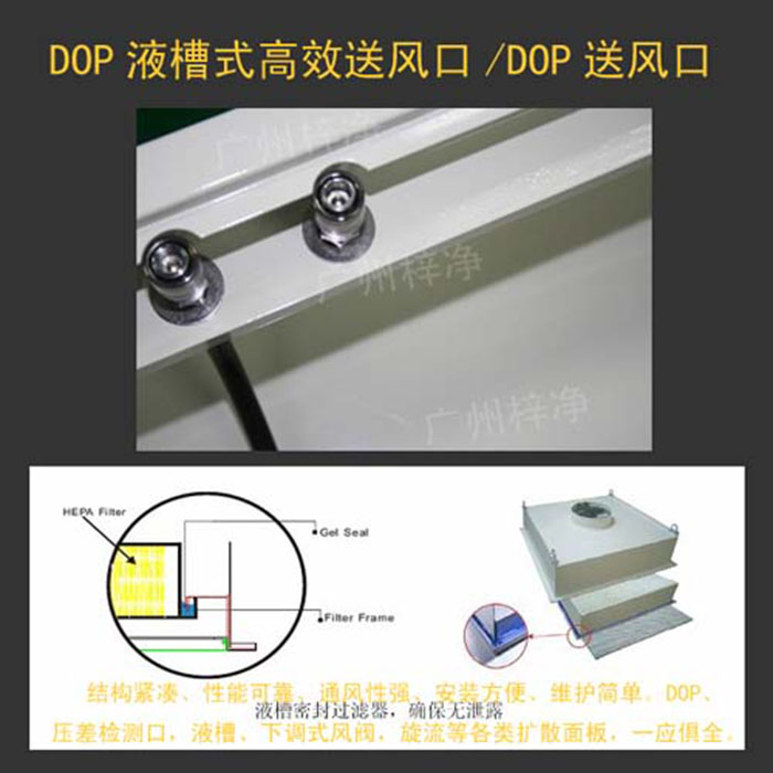 什么叫DOP高效送風口?無泄漏高效過濾器(送風口)簡稱DOP高效送風口或者液槽式高效送風口,解決了因送風口中成框與高效過濾器安裝密封等問題,導致過高效過濾器邊框外漏風的難題,并對已完工的凈化工程在高效過濾器(送風口)泄漏檢測不合格的情況下,可更換本公司研制的無泄漏型高效過濾器進行改裝不需更換原有送風口等其他配件。